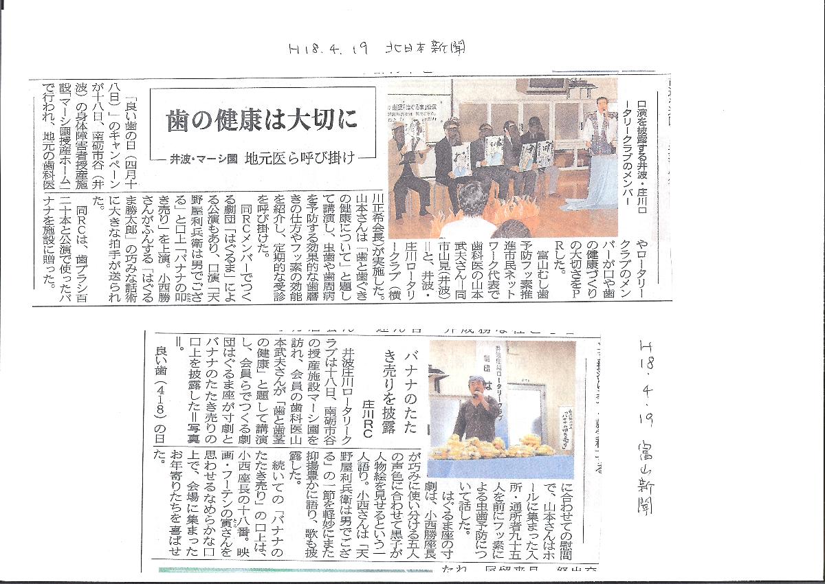 2006年(平成18年)4月18日 南砺市(旧井波町)谷にあります、授産ホーム「マーシ園」を、富山むし歯予防フッ素推進市民ネットワーク[And You (あゆ) の会]と、井波庄川ロータリークラブ劇団「はぐるま」が、協力して訪問して、キャンペーン活動を行いました。
