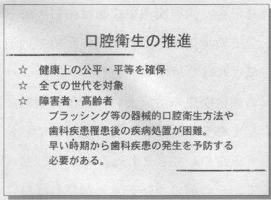 我々は口腔衛生の推進ということでこのようなことを考えています。 健康上の公平、 平等を確保するということは、 やっぱり、 一番大事なことであります。 それから、 全ての世代を対象に致します。 子供達だけではない、 全ての世代、 男女問わず、 全ての世代の方々に対して口腔衛生を推進しないといけない。 そして、 もう一つは、 障害者や、 高齢者の方々が、 障害者になったり、 高齢者になるとですね、 機械的なブラッシングが非常に困難になるわけですね。 特に、 我々歯科医師会では全身麻酔で障害者の方々の治療やってますけれども、 この方々は治療が終わっても後の口腔内の衛生維持が難しいわけですね。 こういった、 機械的なブラッシングがなかなか手が動かないとかがありますから、 とても難しい。 また、 高齢者の方も一緒なんです。 高齢者の方で寝たきりになってしまうとなかなか手が動かないとかですね、 口の中の掃除ができないとかなりますから、 その時に、 やっぱり困ったことになるわけですね。 それで、 機械的な口腔衛生ができない、 しかもこの方々は、 歯科疾患に罹患しやすいですね。 さらに、 健全な方々に比べて、 その後の処置がとても難しいんですね。 我々県民、 国民、 誰でも、 障害者になる、 高齢者になるということは可能性は強く持っていますから、 そういうふうになる前に、 フッ化物で、 フロリデーションで、 口腔内をきれいにしてあげる、 障害者の方でも大丈夫である、 というようなことを是非やっていきたいのです。