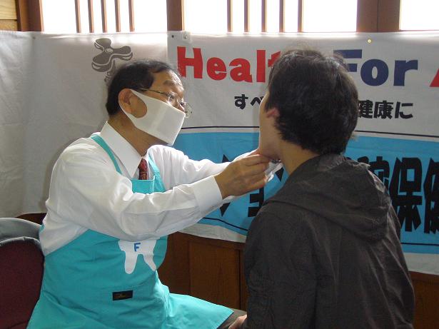 そのご縁で、井波庄川ロータリークラブと富山むし歯予防フッ素推進市民ネットワークは、今回、訓練校に通われる生徒さんに、お口の健康に関心を寄せてもらおうと、歯科健診と歯科衛生士による歯磨き指導、歯科医師の山本武夫代表による健康講話「よい歯で健康―獅子頭のような、丈夫な歯と歯ぐきで、ノミを持とう!」がおこなわれました。山本代表の話は、8020運動、むし歯予防には、フッ素を、歯周病予防には、定期健診と歯石除去、正しい歯ぐき磨きという内容でした。
