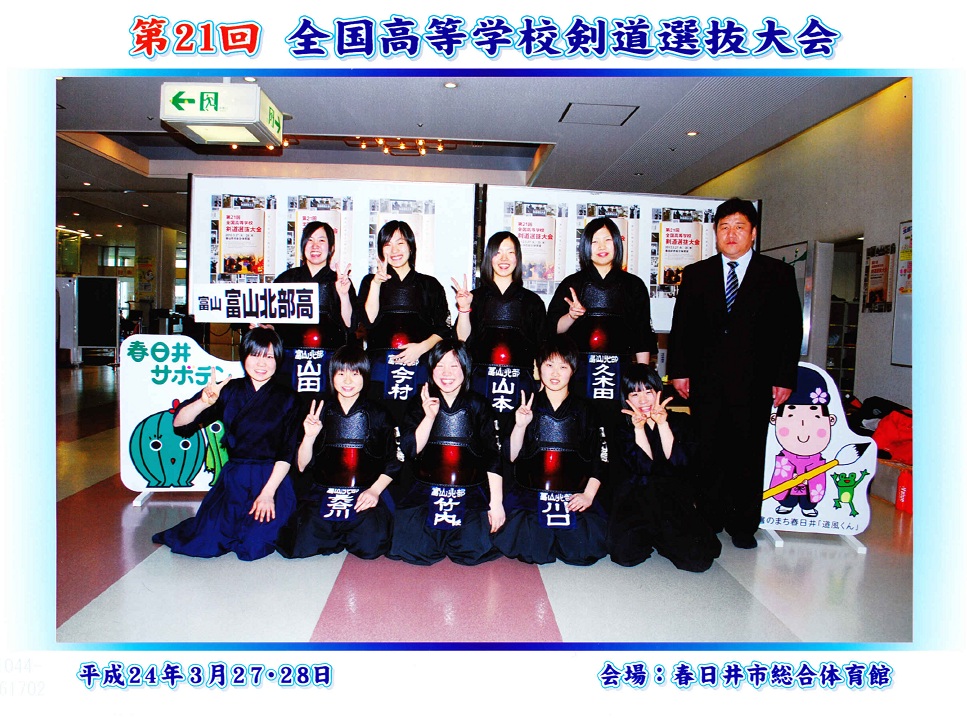 | 昨年は、東日本大震災で中止となって、2年ぶりの選抜大会の開催でした。初めて選抜大会を観戦しました。 小生は、韓国への研修があり、初日の朝11時に、中部国際空港に到着、富山北部の試合進行が気になりながら、名鉄特急に乗りました。1試合目の結果は電車の中で聞き、歓声をあげました。金山駅で、JRに乗り換え、春日井駅に向かいました。途中で、春日井駅の手前に、勝川(かちがわ:勝ち側?)駅がある事がわかり、春日井駅を降りてから、勝川駅行きの切符を、験担ぎに買いました。タクシーで、20分余りで、会場の春日井市総合体育館に到着、富山北部の2試合目以降を観戦しました。 富山県勢は、男子が龍谷富山(試合結果)が出場し惜しくも予選リーグ敗退、女子は富山北部(試合結果)が出場し、見事予選突破を果たしました。 女子は、富山北部が予選リーグ初戦で、高松商(香川県)と対戦、先鋒山田選手が面1本勝ちして、幸先よいスタート、次鋒竹内選手は、惜しくも引き分けで試合を繋ぎ、中堅山本選手は堅実に面1本勝ちし、有利に試合を運び、副将今村選手が小手1本先行して、勝負を決めたかに見えましたが、終盤面を返され、ドキッとしたが、すぐ後に面を決めて、富山北部の勝ちが決まりました。大将戦は、久木田選手が、面を先行されるも、落ち着いて面を返し、引き分けに持ち込み、結果は3-0と圧勝でした。続くリーグ2戦目は、富山北部対流山(千葉県)で、先鋒山田選手は、面1本先行するも、その後面を返され、その後の技が旗が1本づつで優位に進めるも引き分けに終わり、次鋒の竹内選手は、これまた優位に進めるも終盤に逆に面を取られ、相手に先行されました。中堅山本選手は、慎重に技を出すも旗が重く、中盤面を決めるも、そのまま時間が切れ、ここまで全くの互角となりました。副将戦は、流山が上段の選手に対し、今村選手は全く上段を苦にしないタイプで、面を先行し、このまま終わるかと思いきや、相手にタイミングだけの小手を決められ、嫌なムードになりかけましたが、その後、すぐさま、突きを放つと見事に決まり、ここで、一歩リードしました。大将戦は、久木田選手が序盤で面を決めて、このまま逃げ切れるか不安でしたが、引き分けでも勝ちだけに、慎重に試合を運ぼうとした一瞬、面を返されました。しかし、これまた、間もなく面を決めた久木田選手の勝利で、富山北部は3−1で勝利を収め、嬉しい決勝トーナメント出場を勝ち取りました。隣を見ると、1−0の試合がいくつもある中、応援席はガチンコ対決でハラハラしながらも面白い試合でした。2日目の決勝トーナメントは、富山北部は1回戦で、龍谷(佐賀県)と対戦しました。先鋒山田選手は、技を出して攻めるも、旗が重く、1本だけしか上がらない場面が2度あり、結局悔しい引き分けに、次鋒の竹内選手は、慎重に戦いを進め、相手に打たせる場面を作らせず、引き分けて中堅に繋ぎました。中堅の山本選手は、序盤は攻めきれず、中盤に相手に鍔競り合いの反則が出て、その後まもなく出てきた所を面を続けざまに2本決めて、富山北部がリードしました。副将今村選手は、中盤に面を先行されるも、落ち着いて面を返し、このまま終わるかと思われた瞬間、面を決められました。大将戦を前に本数では一歩リードで、久木田選手は引き分けでもチームは勝てる条件で試合が始まりました。相手大将も勝つしかないので、前へ前へと突き進んできました。中盤、久木田選手の間合いが切れた時、面を決められ、その後、返そうと出た所をまた、面を決められ、富山北部は1回戦で敗退となりました。1本しか上がらない旗が、こちら側ばかりにあったので、もしも、そのうち1本でも決まっていたら、勝敗が逆になっていただろうという惜しいし、悔しい結果でした。ベスト16という事になりましたが、選手たちは良く頑張りました。 また、帰りの車中で、山本麻紗子選手が、優秀選手に選ばれたという嬉しいニュースが入ってきました。富山県勢としては男女を通じて、初めてということだそうです。個人戦ではないので、団体戦で決勝トーナメントへ行けなければもらえなかった賞という意味では、全員でもらった賞ともいえます。これを励みに、また県勢剣士で続く事を期待します。(山本武夫) |