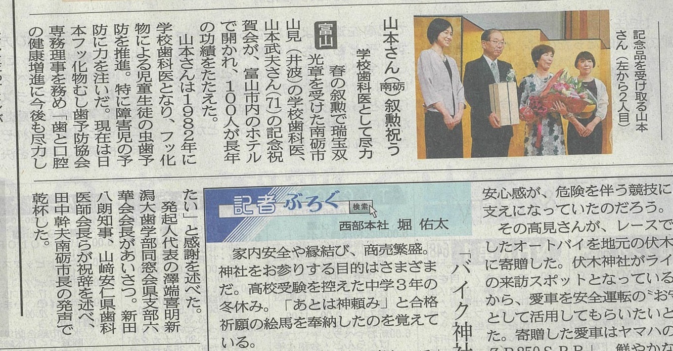 4/29新聞等で発表があり、5/12東京の国立大劇場にて、文部科学省の伝達式がありました。その際、敬愛する古田勲富山大学名誉教授(瑞宝中綬章受章)と偶然一緒になり、お互いに撮影をしあいました。その後、皇居に移動し、天皇陛下の拝謁を頂きました。 9/9、新潟大学歯学部同窓会富山県支部(六華会)と南砺市歯科医師会合同の叙勲祝賀会を、ANAクラウンプラザホテル富山にて、開催して頂きました。