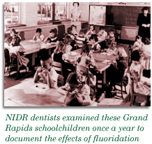 This finding sent Dean's thoughts spiraling in a new direction. He recalled from reading McKay's and Black's studies on fluorosis that mottled tooth enamel is unusually resistant to decay. Dean wondered whether adding fluoride to drinking water at physically and cosmetically safe levels would help fight tooth decay. This hypothesis, Dean told his colleagues, would need to be tested.In 1944, Dean got his wish. That year, the City Commission of Grand Rapids, Michigan-after numerous discussions with researchers from the PHS, the Michigan Department of Health, and other public health organizations-voted to add fluoride to its public water supply the following year. In 1945, Grand Rapids became the first city in the world to fluoridate its drinking water.The Grand Rapids water fluoridation study was originally sponsored by the U.S. Surgeon General, but was taken over by the NIDR shortly after the Institute's inception in 1948. During the 15-year project, researchers monitored the rate of tooth decay among Grand Rapids' almost 30,000 schoolchildren .After just 11 years, Dean- who was now director of the NIDR-announced an amazing finding. The caries rate among Grand Rapids children born after fluoride was added to the water supply dropped more than 60 percent. This finding, considering the thousands of participants in the study, amounted to a giant scientific breakthrough that promised to revolutionize dental care, making tooth decay for the first time in history a preventable disease for most people.